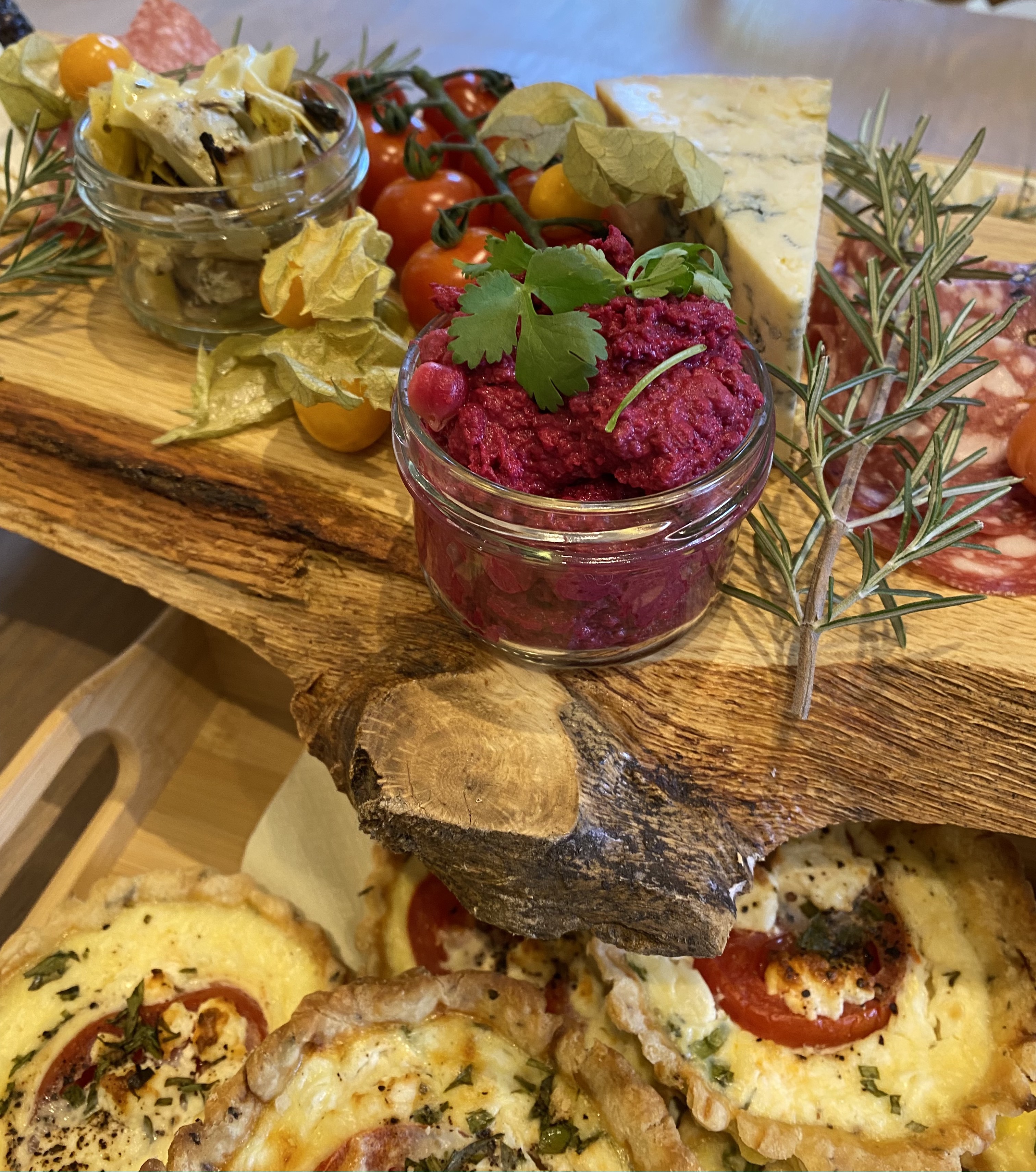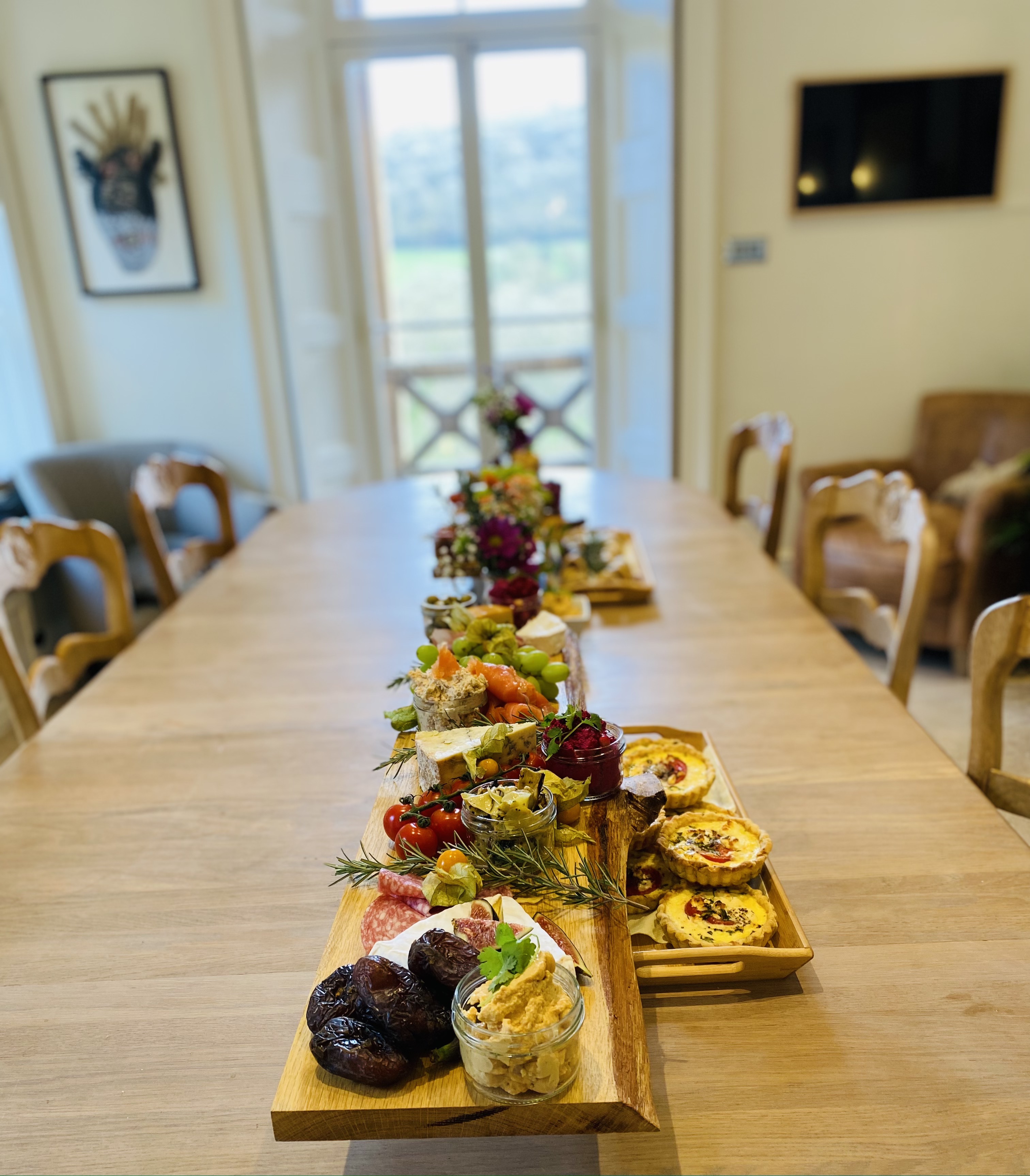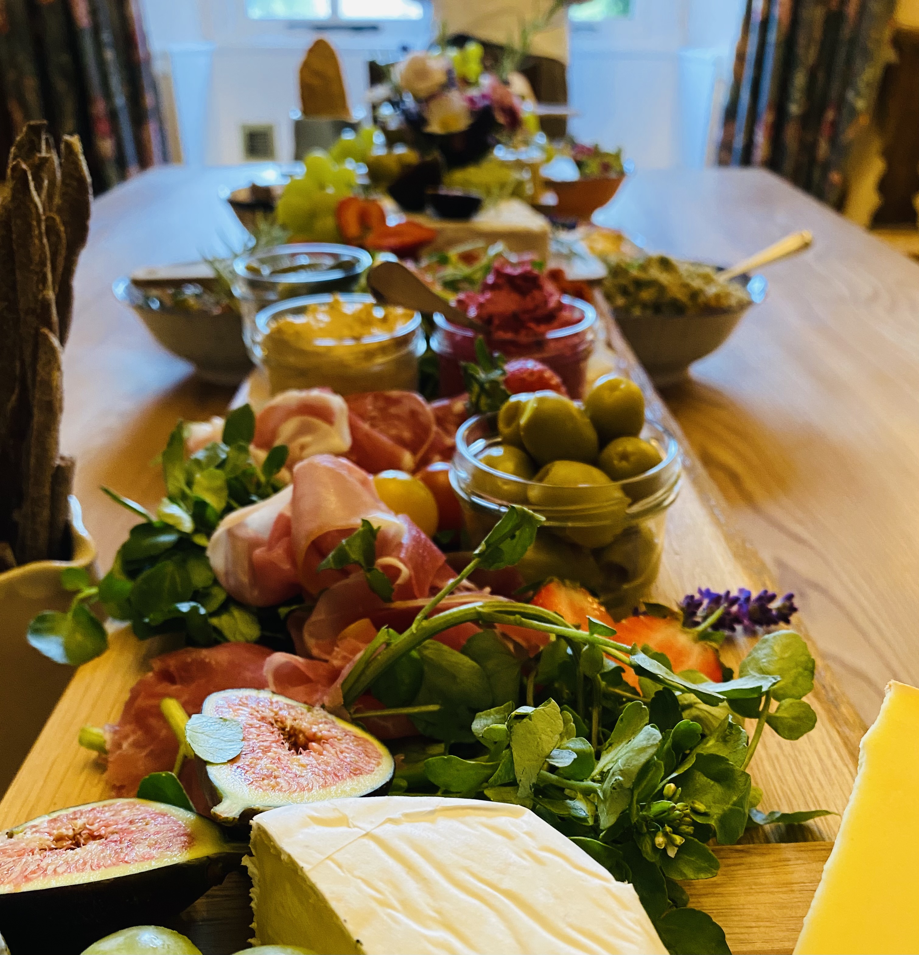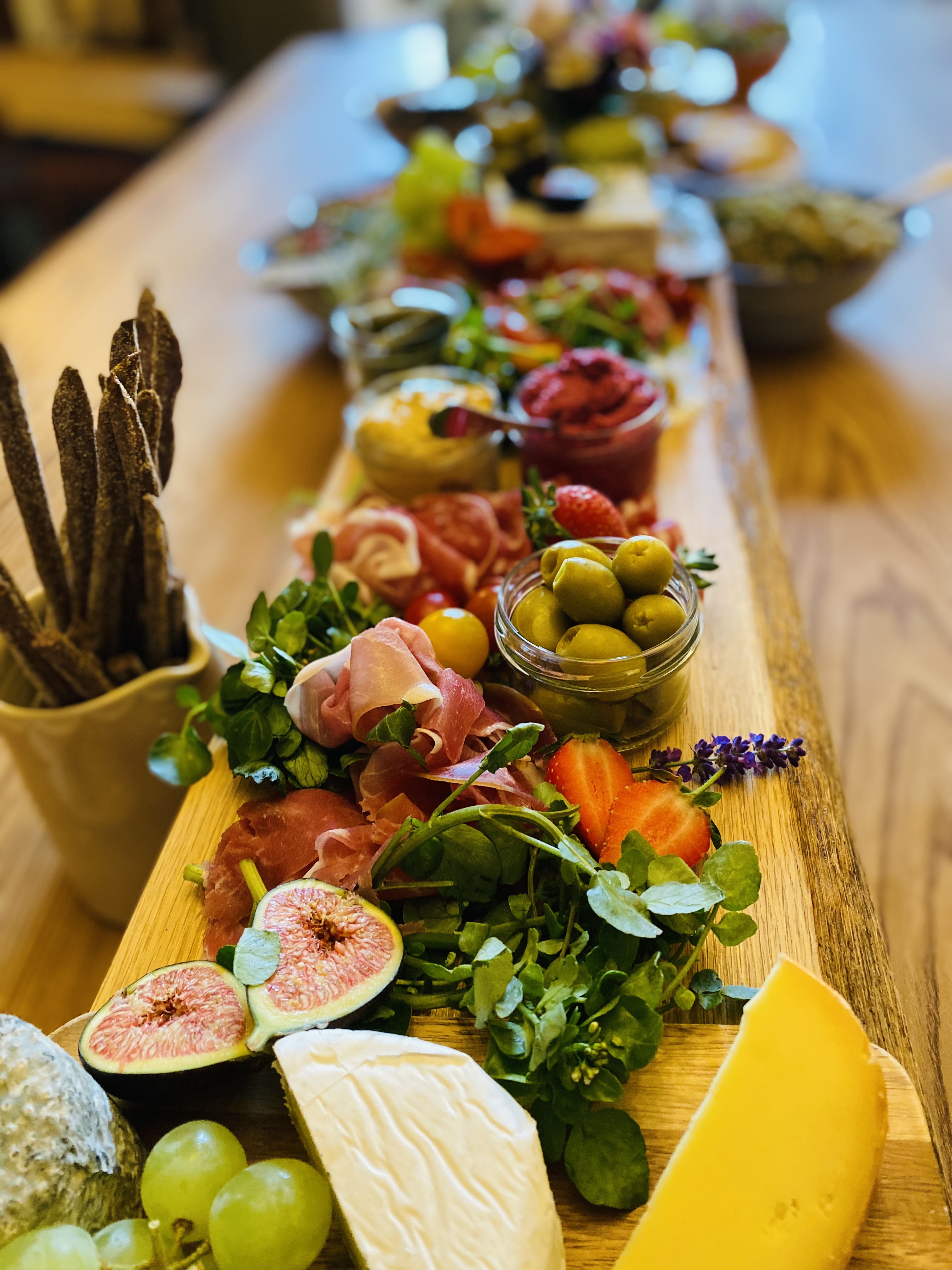 Grazing tables can include local cheeses, charcuterie, homemade chutney, pickles, flatbreads, dips, olives, nuts, fruit and more. Why not add in homemade salads, tarts and sausage rolls.