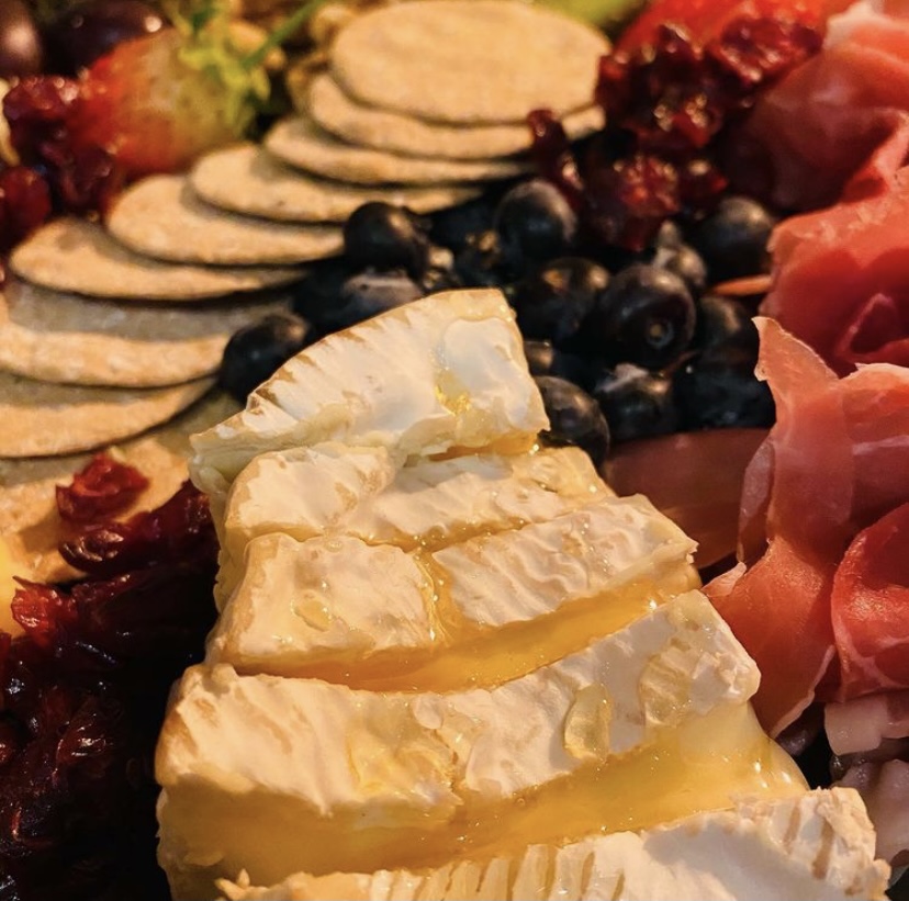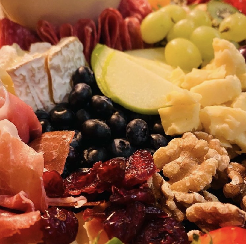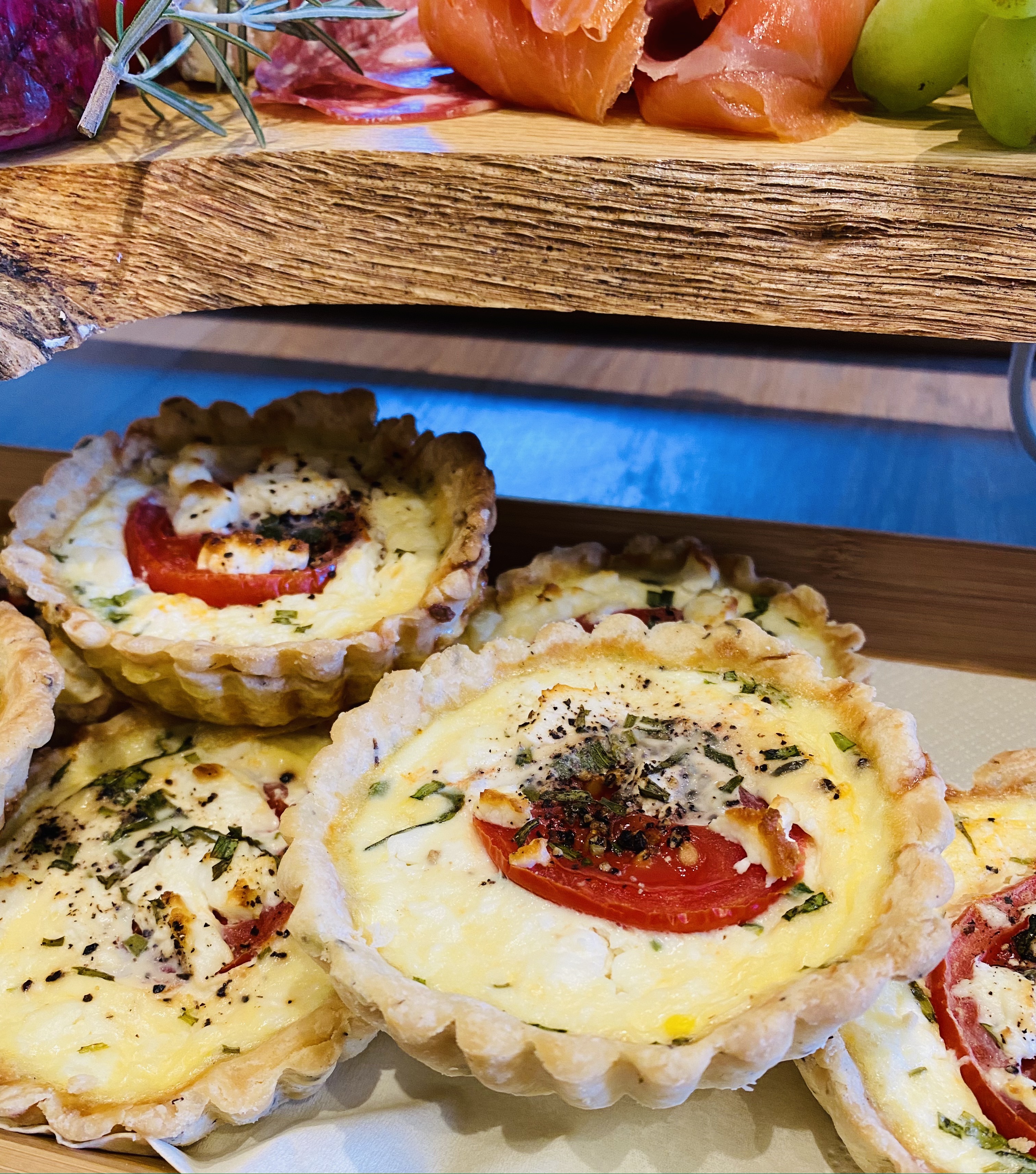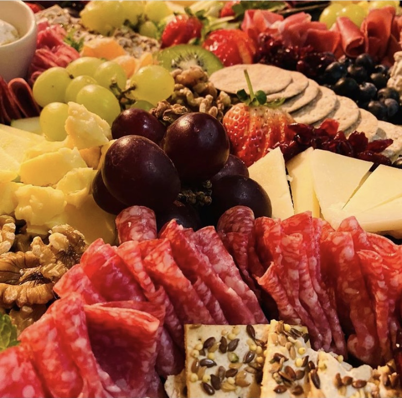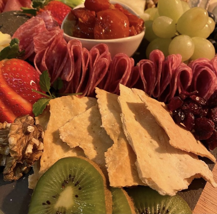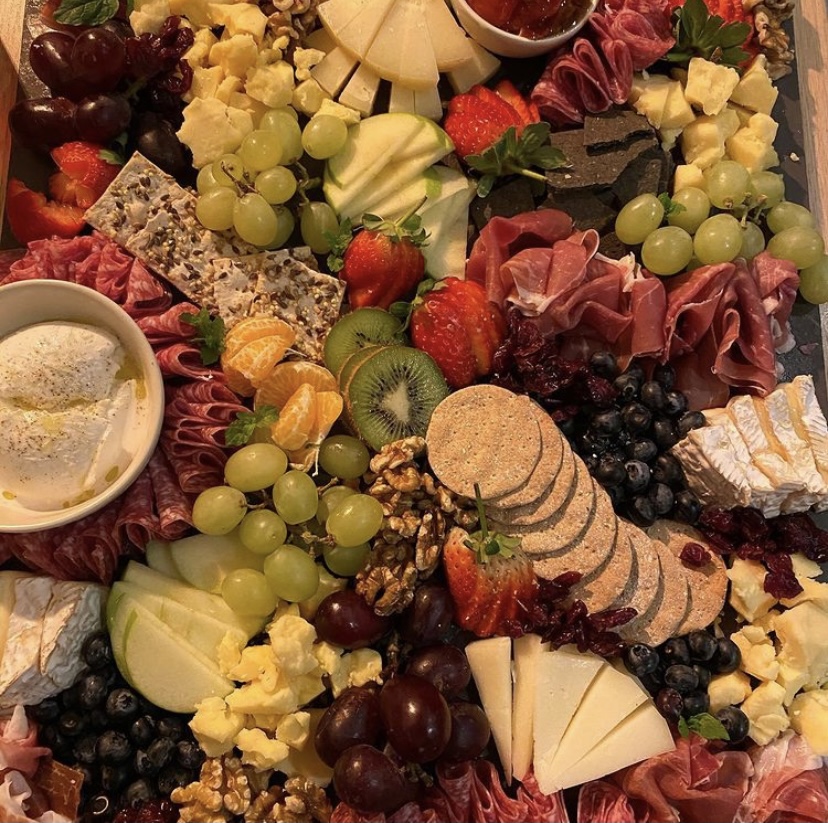 Grazing tables can include local cheeses, charcuterie, homemade chutney, pickles, flatbreads, dips, olives, nuts, fruit and more. Why not add in homemade salads, tarts and sausage rolls.